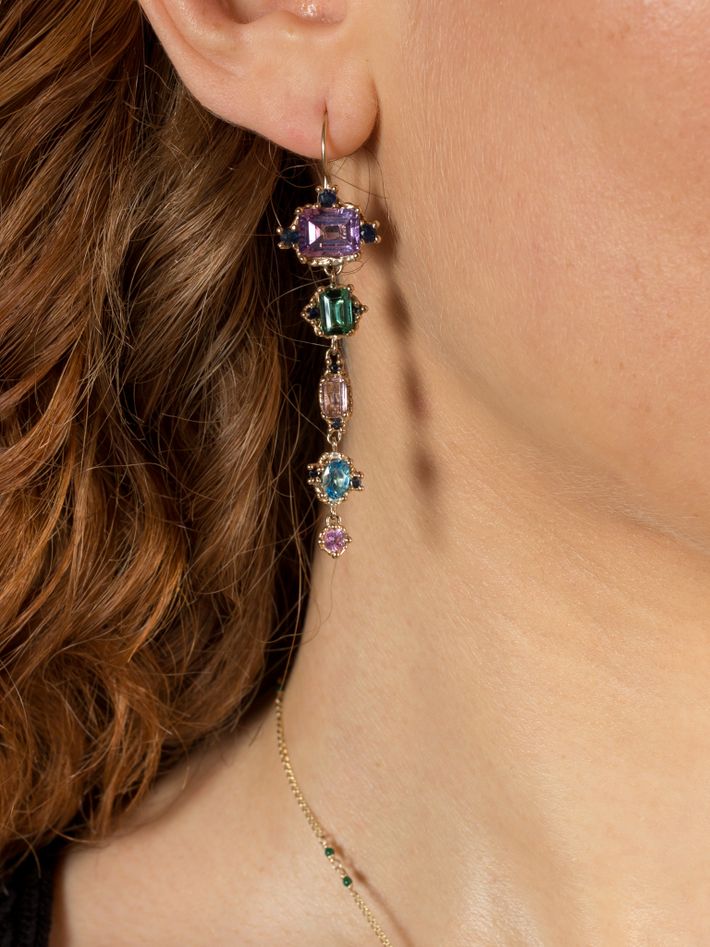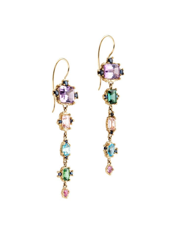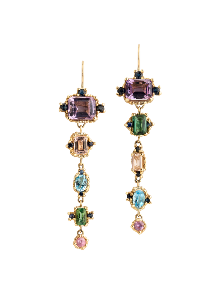 9 kt solid yellow gold2 topazs, 4 tourmalines, 2 amethysts & 20 sapphiresPair of earrings