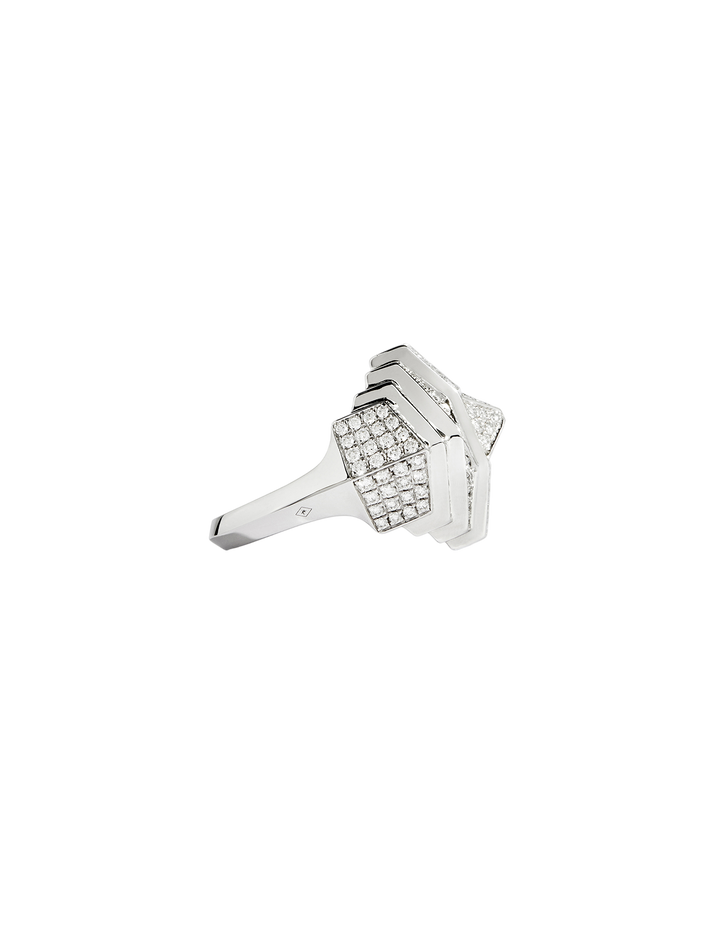 In her flagship store just off the Tuileries Gardens in the heart of Paris’ 1st arrondissement, designer Amélie Huynh presents her sharp, architectural jewellery. Finding its design language at the intersection of the Brutalist and Art Deco movements, and infused with a touch of Parisian rock & roll, each Statement Paris piece exudes power, strength, and ambition – serving as personal armour to the world. Trained with a heritage fine jewellery ‘maison’ on the famed Place Vendôme, Amélie has translated the traditional codes of fine jewellery into a modern interpretation with Statement; elevating sterling silver to the position of primary material. Throughout her collections, it takes center stage, plated in white rhodium and often set with micro-pavé of natural diamonds. The cornerstone of the collection is the iconic ‘My Way’ ring, which embodies the architectural, cool, and bold design language of the brand while showing extreme finesse through its micro-pavé diamond setting and delicate craftsmanship. It is this blend of raw strength and refined elegance, as well as its surprising use of silver as its primary metal, that defines Statement Paris – resulting in jewellery that is both bold and timeless.