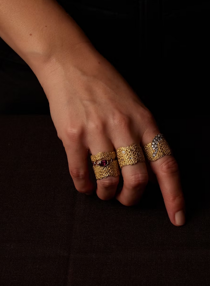 “Metal, softened into movement. Megan Brown’s work captures the poetry of textile in fine jewellery, where every piece feels both engineered and instinctive.”