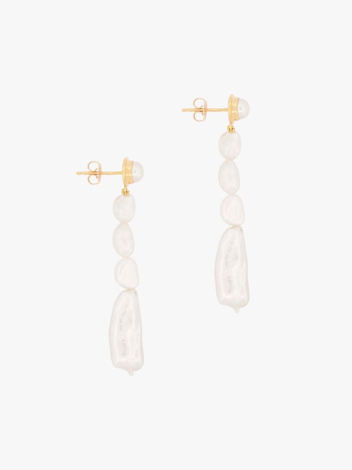 round freshwater pearl stud with three short and one longer baroque pearls suspended underneath. All pearls are one-of-a-kind and may differ slightly