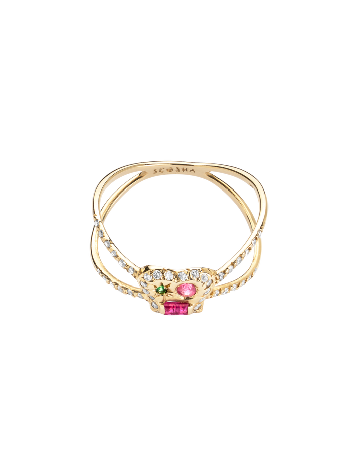 Set on a double band set with diamonds and centred gemstones, this piece is super playful and adds dimension.