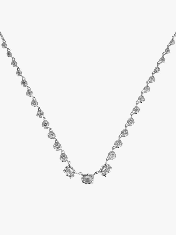 three 0.20ct emerald cut diamonds and 22 small, round cut diamonds