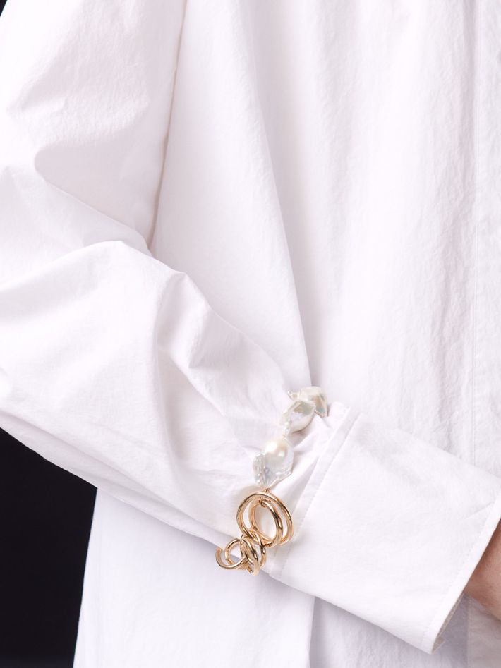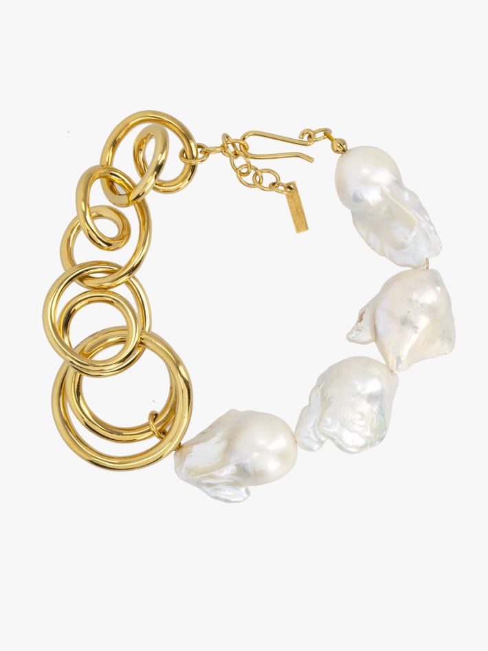 The loops of its vermeil gold chain oscillate and pirouette, and is then interrupted by a string of baroque pearls. A contemporary beauty!