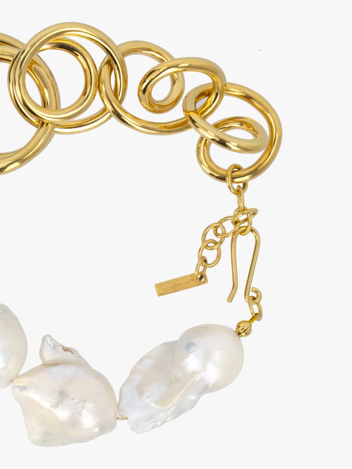 A string of irregular baroque pearls with a chain of twisted gold vermeil loops.