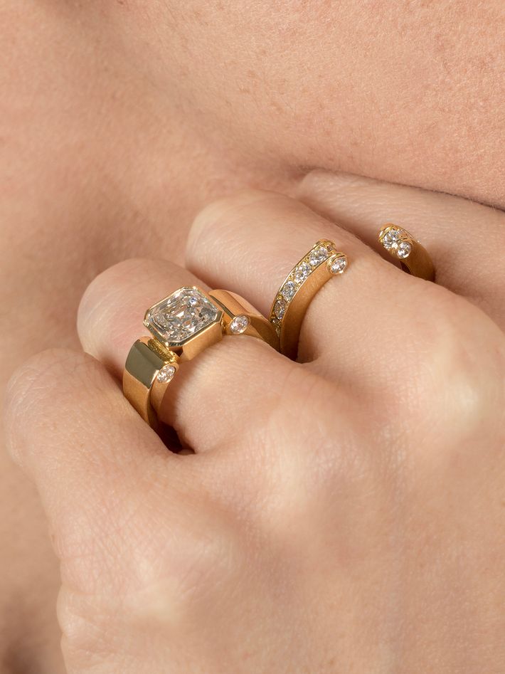 Handmade from 5.98 grams of certified 18K recycled yellow gold, each ring is adorned with a total of 1.27 carats of VVS diamonds (E-F color).