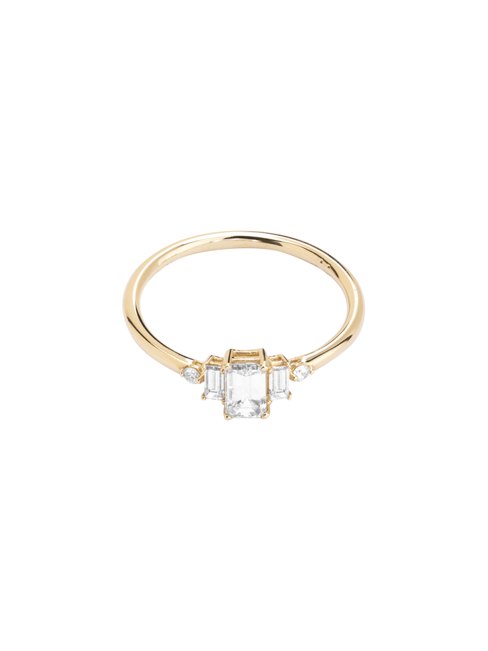 A central 5 x 3mm emerald cut baguette diamond, with two 3 x 1.5mm baguette diamonds and two 1.5 mm round diamonds.