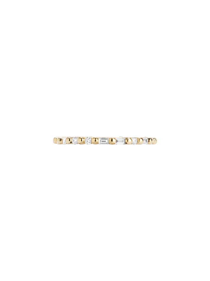 This piece makes a unique wedding band alternative with its randomly spaced round and baguette diamonds.