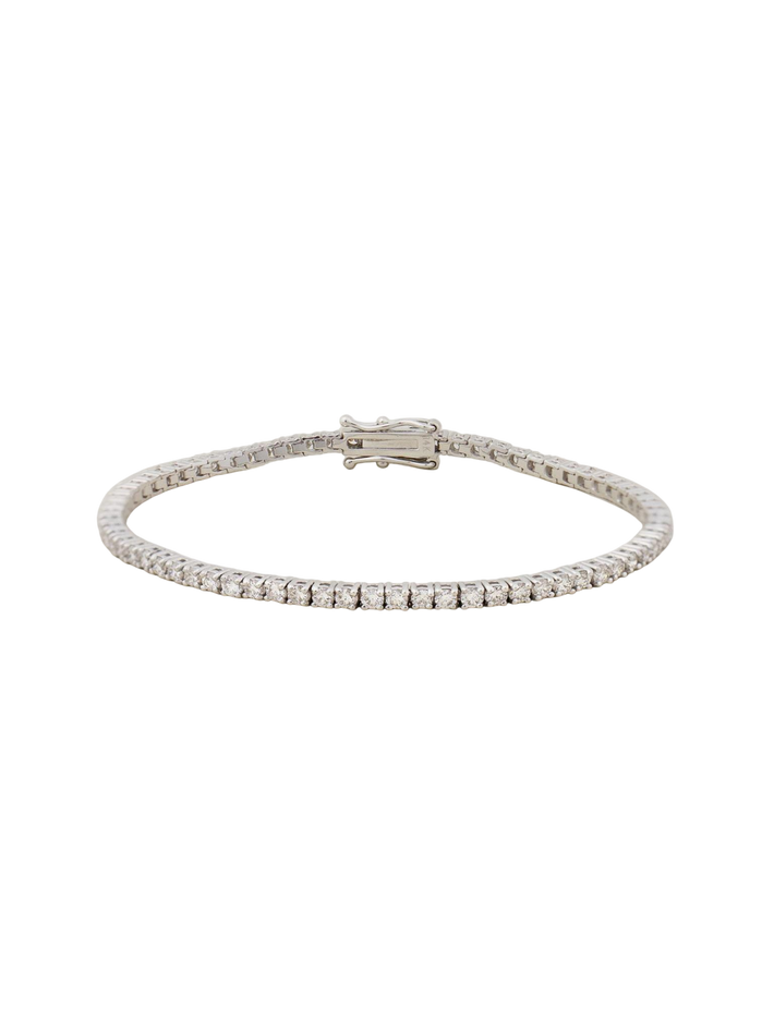 58.3% gold content, plated with rhodium, cool white hues. Relatively hard making it a popular choice for jewellery that lasts a lifetime. 14kt gold is hypoallergenic and generally safe for people with sensitive skin.