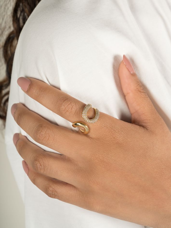 Double beam ring with one side white pavé diamonds