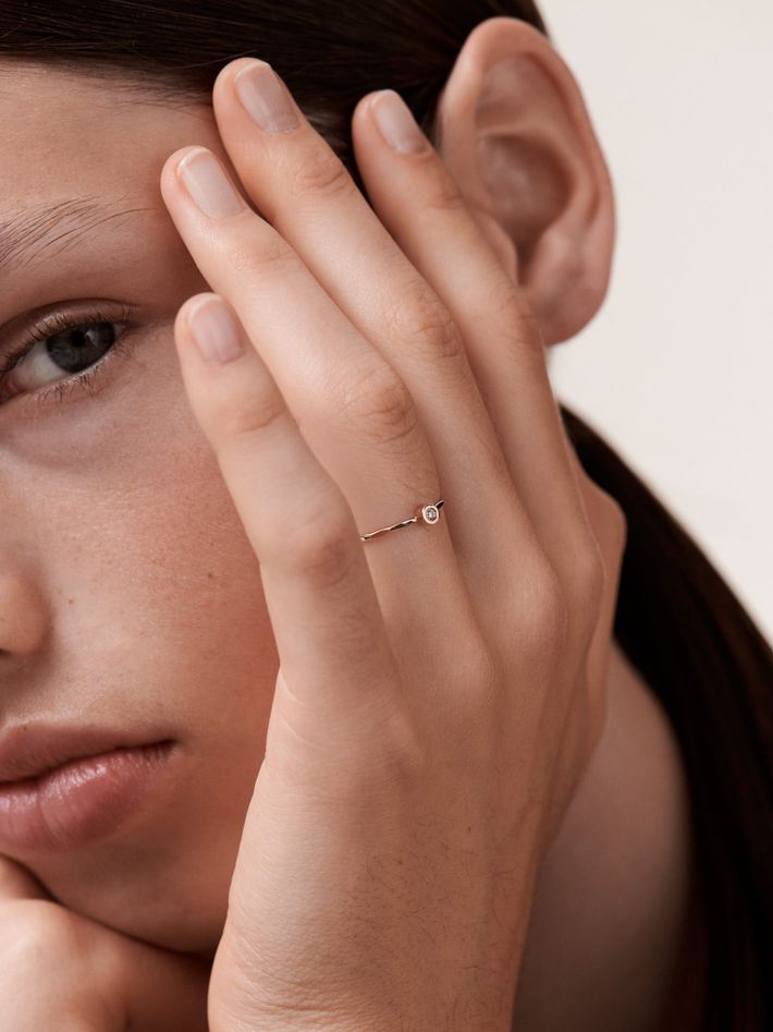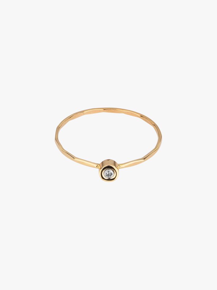 Minimalist and made from 14k recycled gold, this thin gold band set with a single diamond is perfect for stacking, or shining on its own.