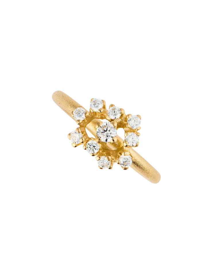 Frosty halo - ring in 18k yellow gold with 0,37ct diamond (1x0,10+9x0,03), 2 mm.
