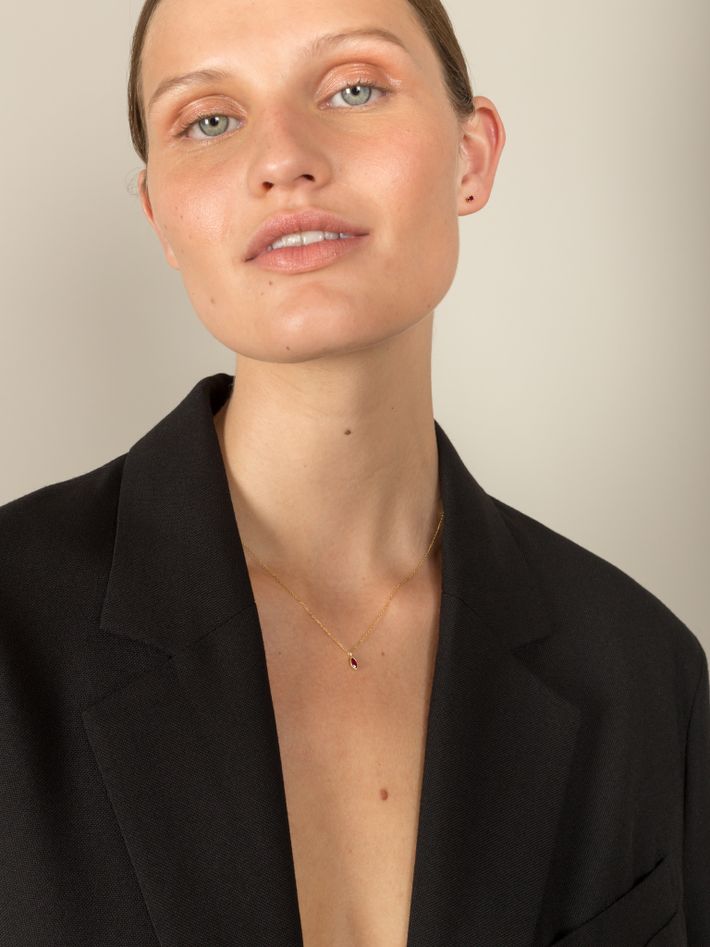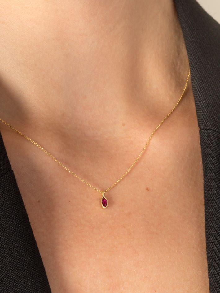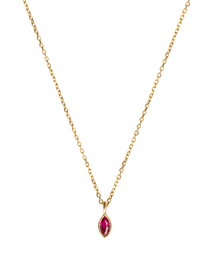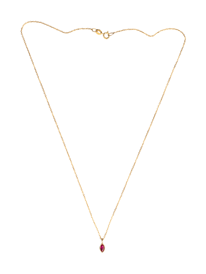 A classic ruby necklace set with an elongated marquise ruby and miligrain detailing.