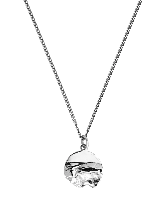 A circle pendant with molten detailing makes this necklace a statement piece.
