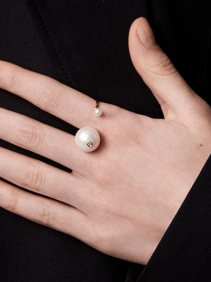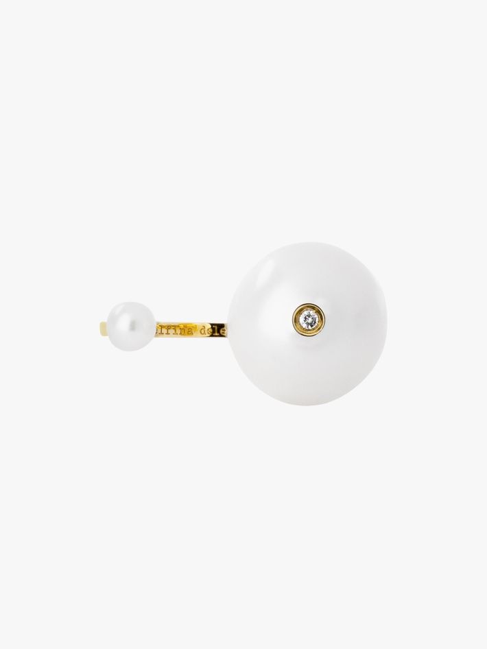 two freshwater pearls that seem to be floating on the hand, with a white diamond set on the larger pearl