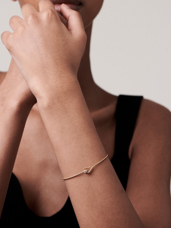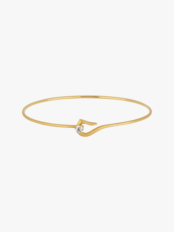 We are hooked on this beautiful bangle with its focal point a brilliant cut diamond 'hooked' at the closure.