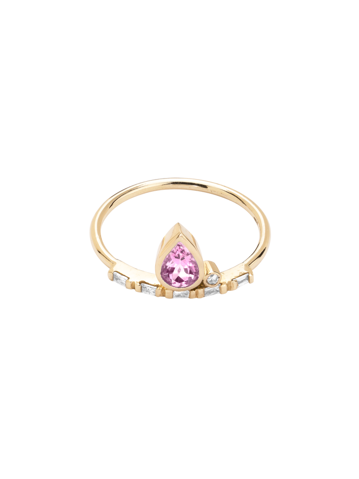 A piece set with pink sapphire and finished with a thin gold band with baguette diamonds, this would look lovely stacked with other rings.