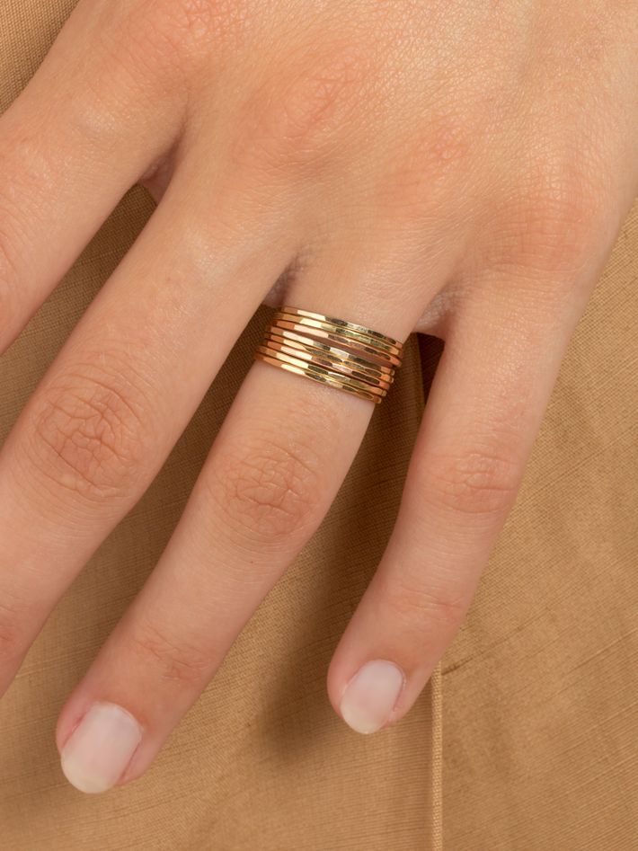 Featuring a rainbow of gold types, this ring stack brings a gradient of warmth along the finger. Each ring can also be worn as singles.