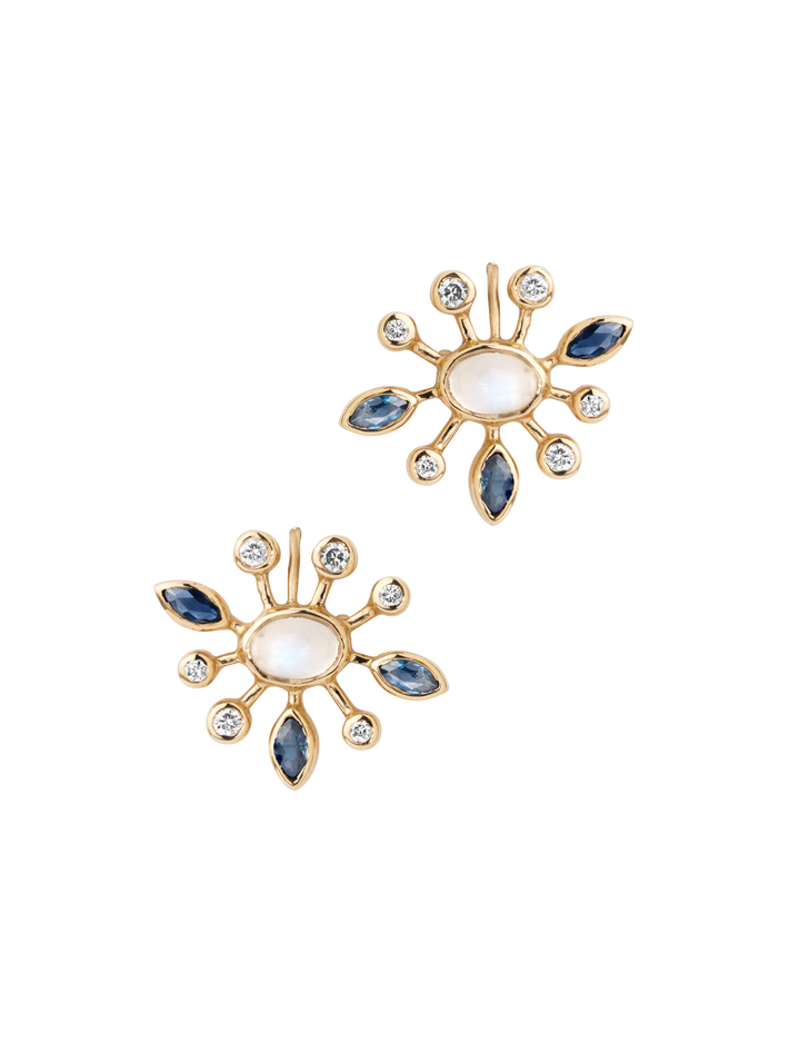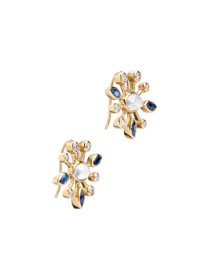 Only one piece made14 kt solid yellow gold2 moonstones, 6 sapphires & 12 diamondsPair of earrings