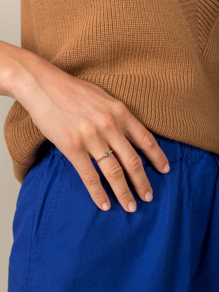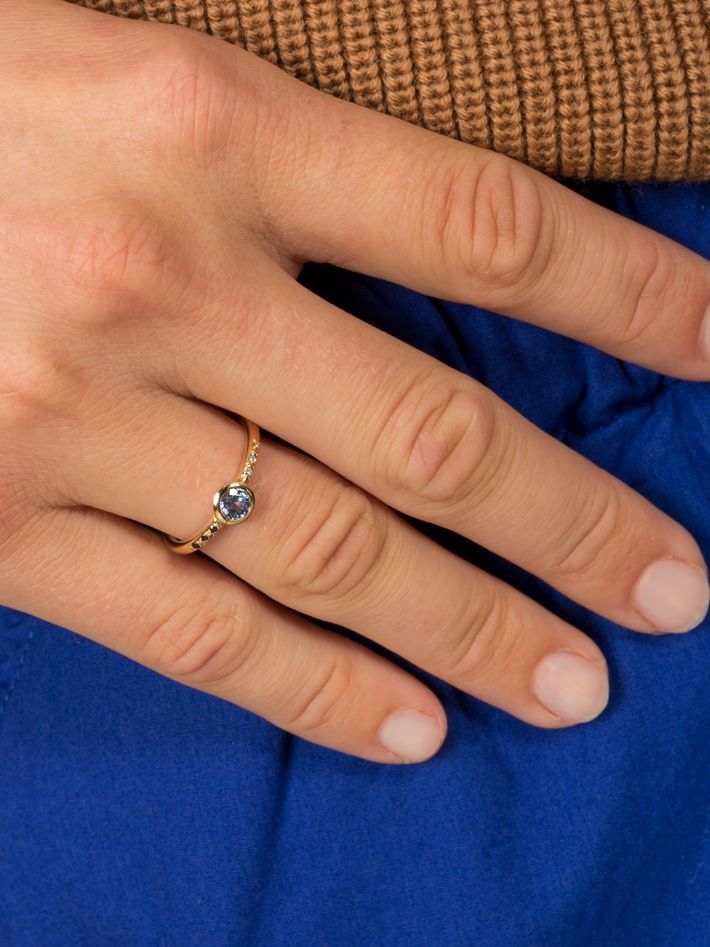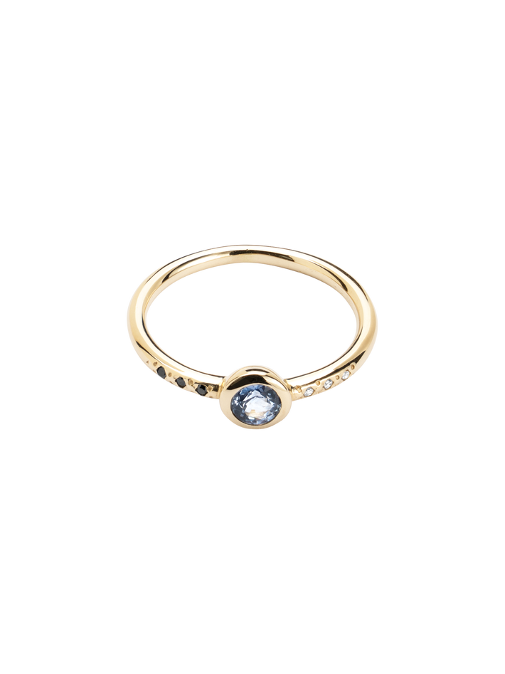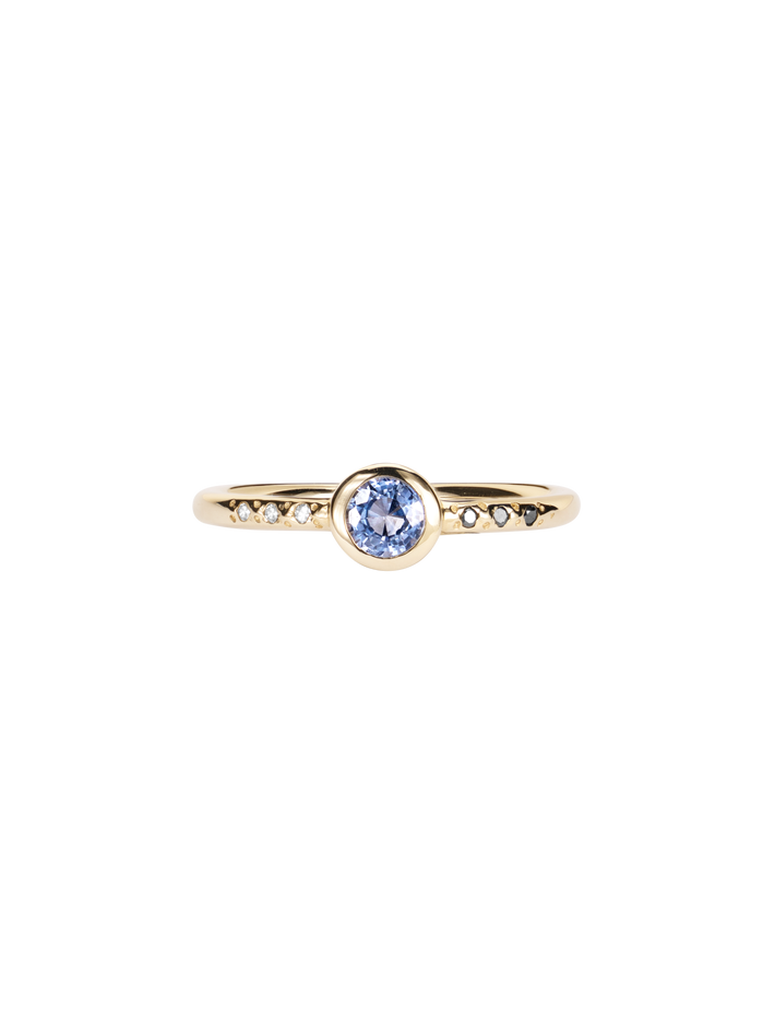 A beautiful delicate ring set with sapphire and tiny white & black diamonds, this piece makes a nice engagement ring alternative.